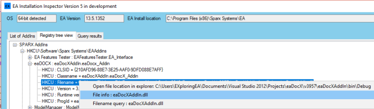 - Adds a green back color on the EA version and location to indicate which version is providing the COM server to the EA API.