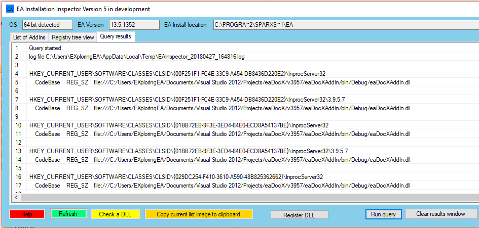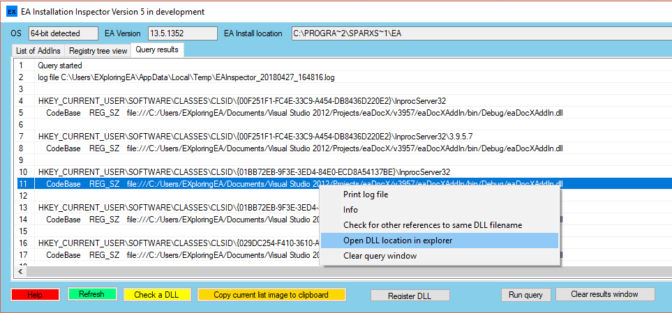 As an example the current test versions has only a single item implemented: you select a DLL and the registry queries any instances of the filename in HKCU. This is to look for multiple instance that may be registered. Thinking of other things we do and of course welcome feedback on what others find useful. Note - as the query can take time this is done in the background so no instant results but will display in query window when done; more to do on this when the requirements are finalised