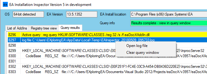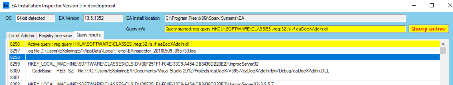 - Adds a green back color on the EA version and location to indicate which version is providing the COM server to the EA API.