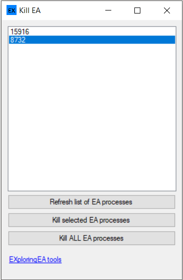 During the development and testing of EA AddIns there are times when you may wish to ensure that no EA processes are still running. This utility provides a list of process ID for all active EA instances with buttons to: